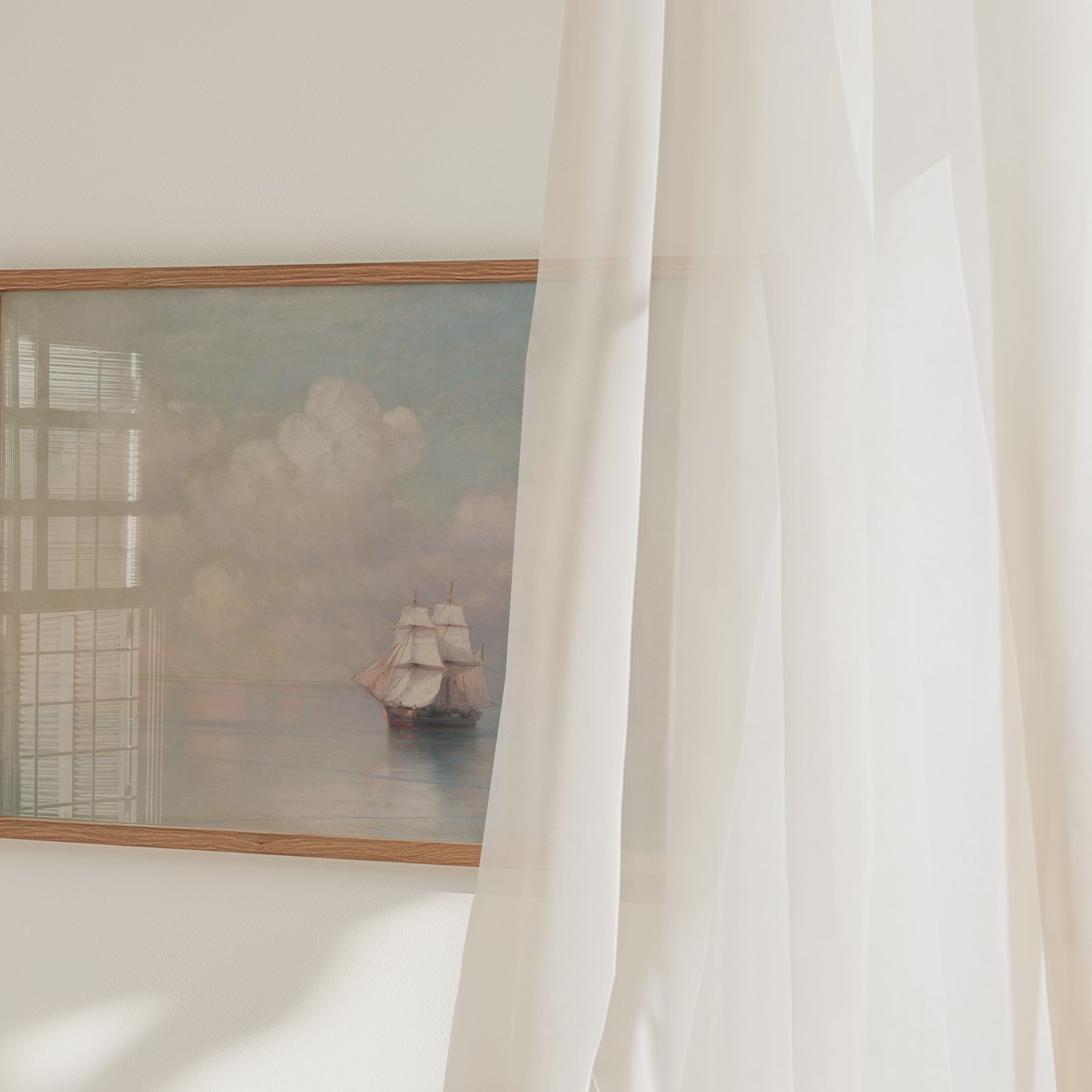 A fine art print of a 19th-century seascape, featuring a sailing ship moving slowly across calm water beneath a sky filled with light and fluffy clouds. The artist captures that still, hazy light where the colours soften into pinks, creams and blue against the open horizon.